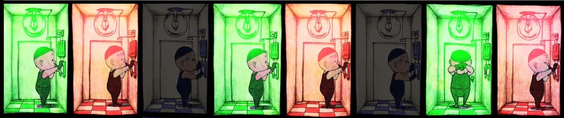 W mrocznych wnętrzach fabryki telewizorów, gdzie pracują krasnoludy w czerwonych, niebieskich i zielonych barwach, toczy się monotonna egzystencja pozbawiona pytań o własną tożsamość. Midori, zielony krasnolud, nagle zyskuje świadomość i postanawia stworzyć coś własnego, kwestionując dotychczasowy porządek i szukając sensu w swojej pracy. Krótki film animowany z Tokyo University of the Arts, eksplorujący tematy tożsamości, kreatywności i buntu przeciwko systemowi.